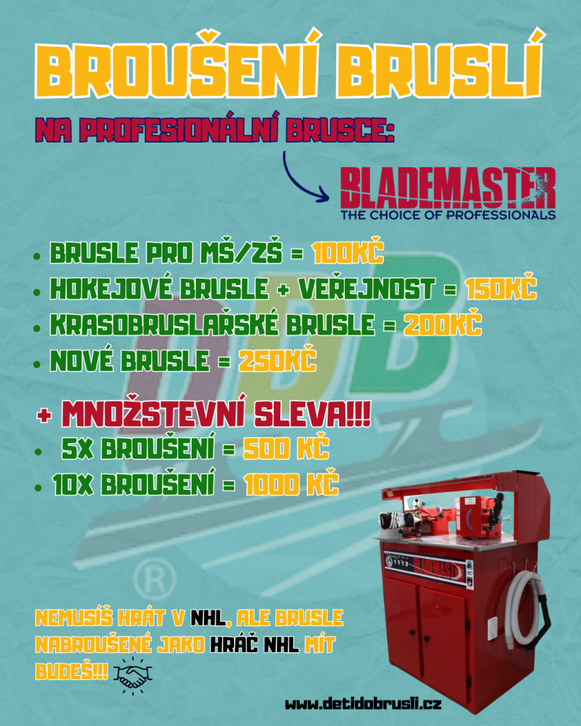 Spolek Děti do bruslí nabízí profesionální a certifikované broušení bruslí pro mateřské a základní školy, hokejové i krasobruslařské kluby a širokou veřejnost. Brousíme na speciální brusce kanadské výroby Blademaster, kterou používají profesionální kluby a hráči NHL.