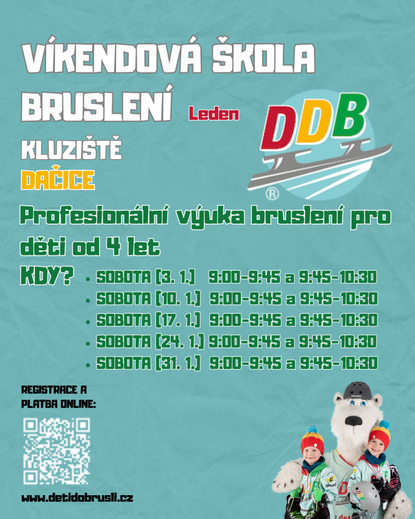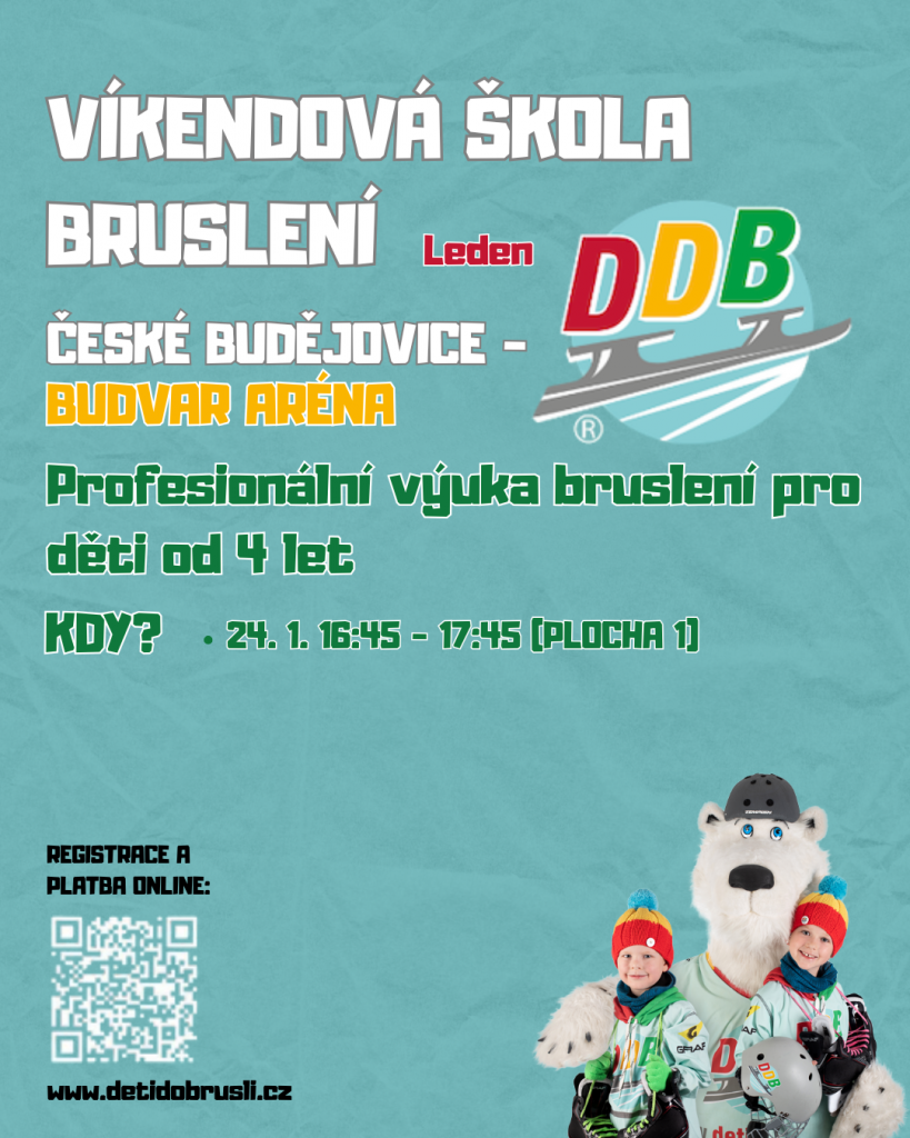 Jako každý rok, tak i v tomto školním roce pro Vás otevíráme Víkendovou školu bruslení na zimním stadionu v Soběslavi (kažná neděle), v Budvar Aréně v Českých Budějovicích (datumy viz. leték) a na velkovním kluzišti Dačice (každá sobota).