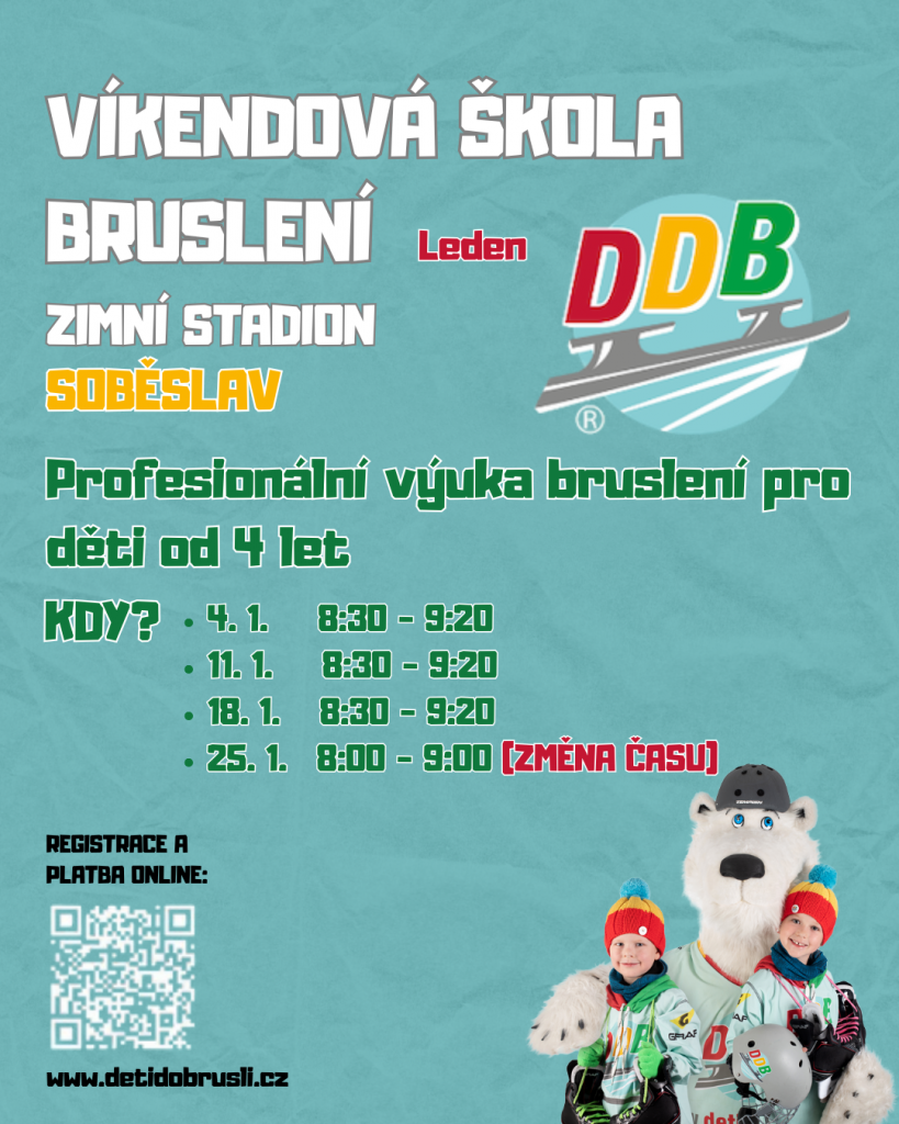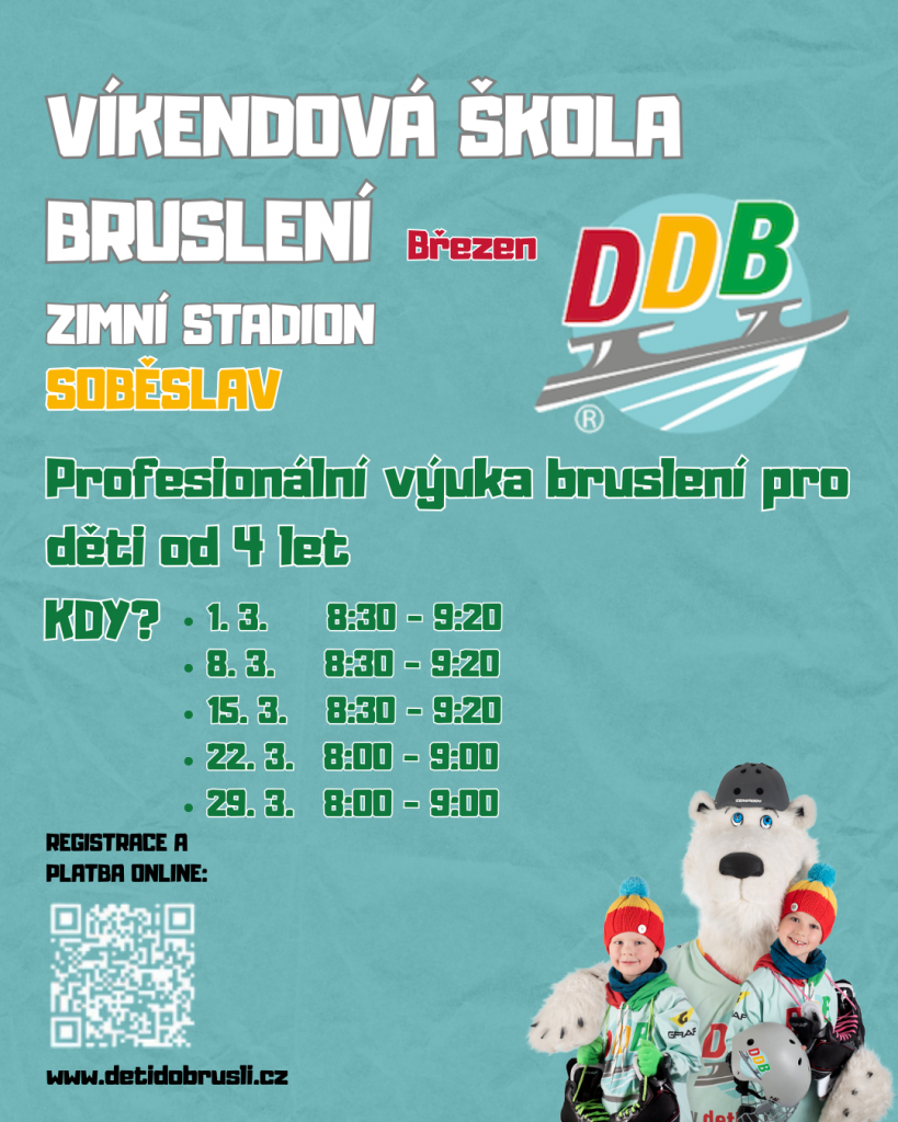 Jako každý rok, tak i v tomto školním roce pro Vás otevíráme Víkendovou školu bruslení na zimním stadionu v Soběslavi (kažná neděle), v Budvar Aréně v Českých Budějovicích (datumy viz. leték) a na velkovním kluzišti Dačice (každá sobota).